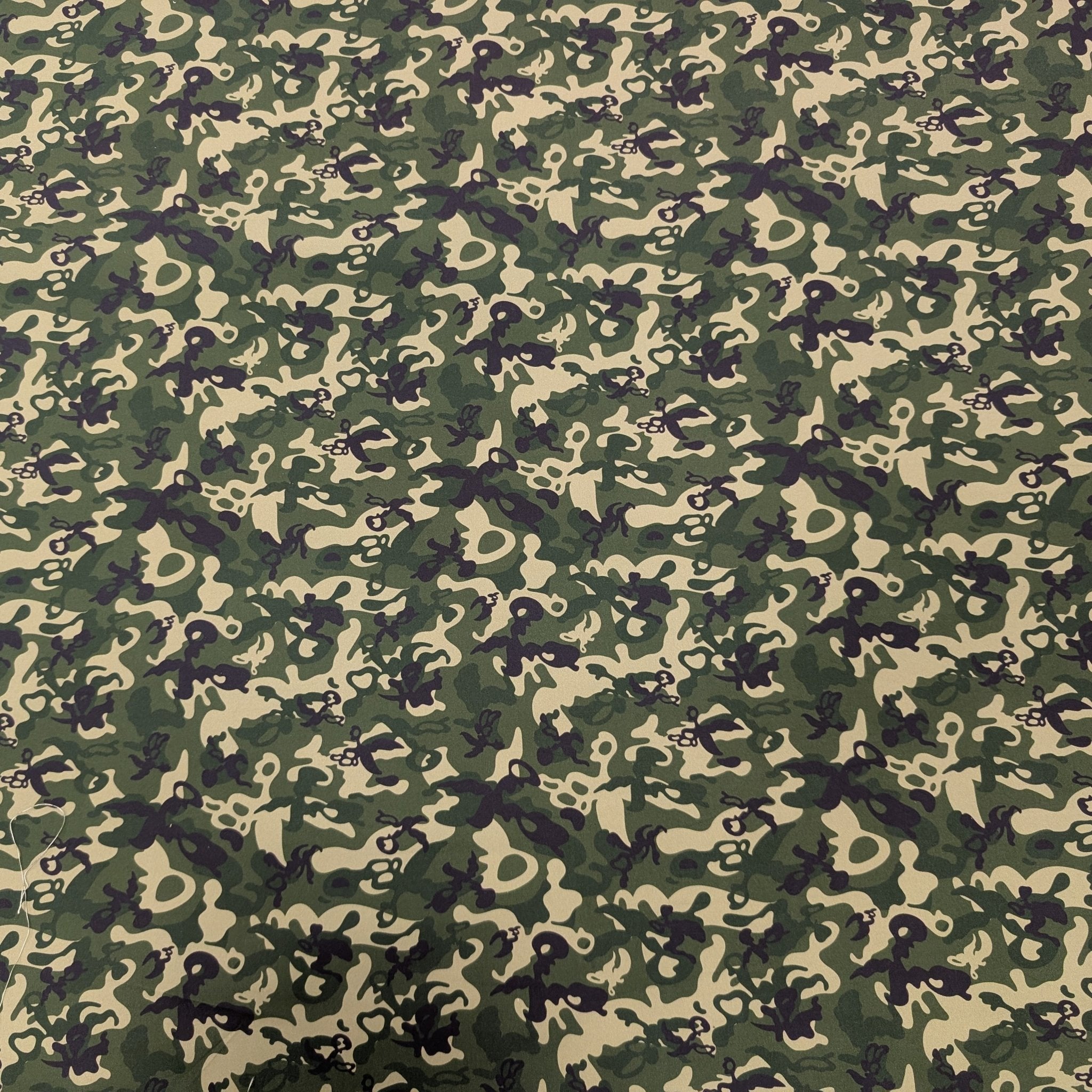Soft handling fabric with interesting camouflage print incorporating scissors design. NOT waterproof. Breathable
