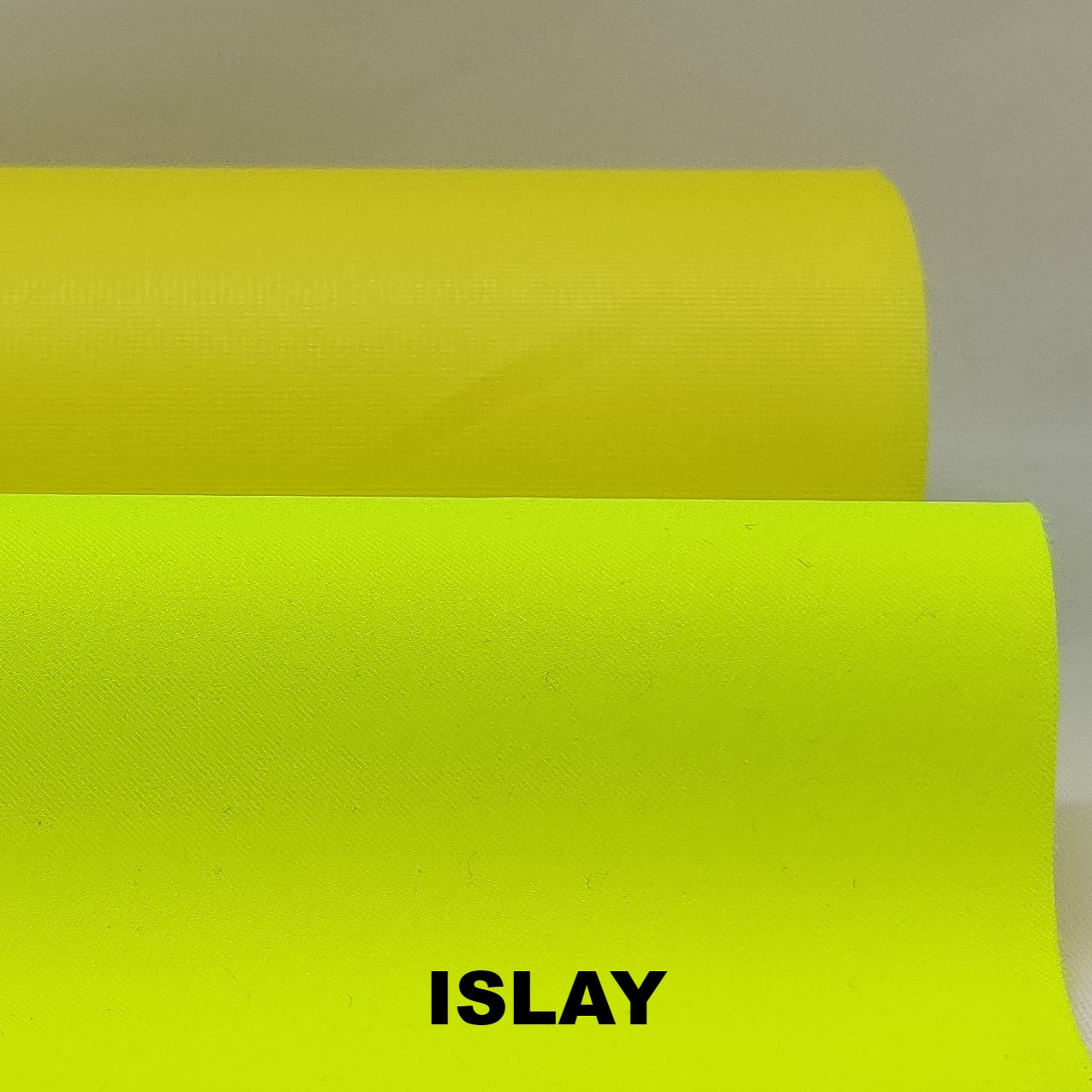 Gore Islay. Fluorescent Yellow, highly breathable and three layer waterproof fabric. We believe that this was originally used for workwear.